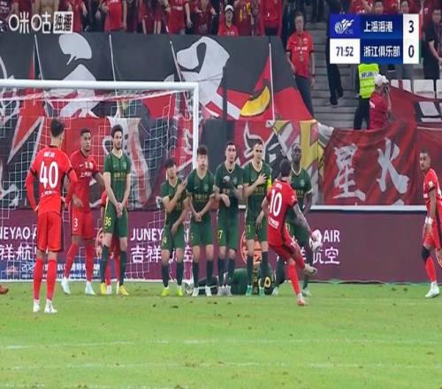 第72分钟,海港前场禁区外任意球机会,维塔尔直接射门将球转进球迷右上角死角,赵博极限扑救依然鞭长莫及,海港已经三球领先。