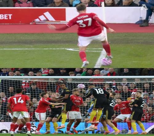 森林对卡塞米罗首开纪录的角球判罚表示不满。萨沃纳在与舍什科的空中对抗中占上风,然后试图将球留在界内。