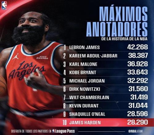 NBA历史最新得分榜:詹姆斯无人可挡!哈登进前十无库里身影